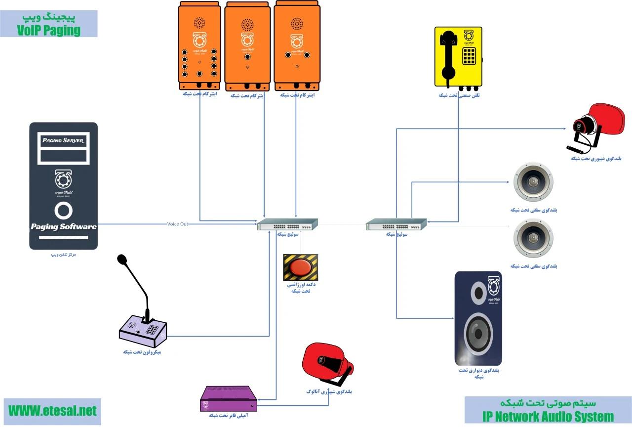 سیستم صوتی تحت شبکه (IP Network Audio System) شامل تجهیزات صوتی مثل بلندگو (Speaker) آمپلی فایر (Amplifier) و اینترکام (Intercom) تحت شبکه است. به منظور مدیریت سیستم صوتی تحت شبکه از مرکز تلفن ویپ (VoIP Telephone) استفاده می شود به همین دلیل به آن پیجینگ ویپ (VoIP Paging) هم گفته می شود. وظیفه ارسال و دریافت صدا در پیجینگ ویپ بر عهده تبدیل کننده های دیجیتال به آنالوگ و آنالوگ به دیجیتال است (DSP) که صدا را در قالب بسته های دیتا انتقال می دهد. سیستم صوتی تحت شبکه می تواند در بستر شبکه موجود در سازمان ها و کارخانه ها بدون افزودن کابل کشی مجدد نصب و راه اندازی شود.