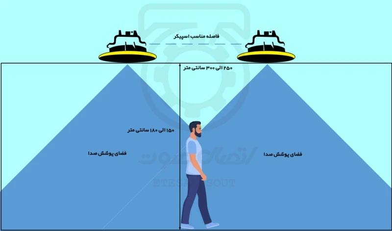 • برای بلندگوهای سقفی، فاصله بین آنها معمولا ۲ تا ۴ متر است. برای بلندگوهای شیپوری فاصله می تواند بیشتر باشد البته بسته به قدرت و نوع بلندگو.
