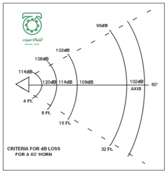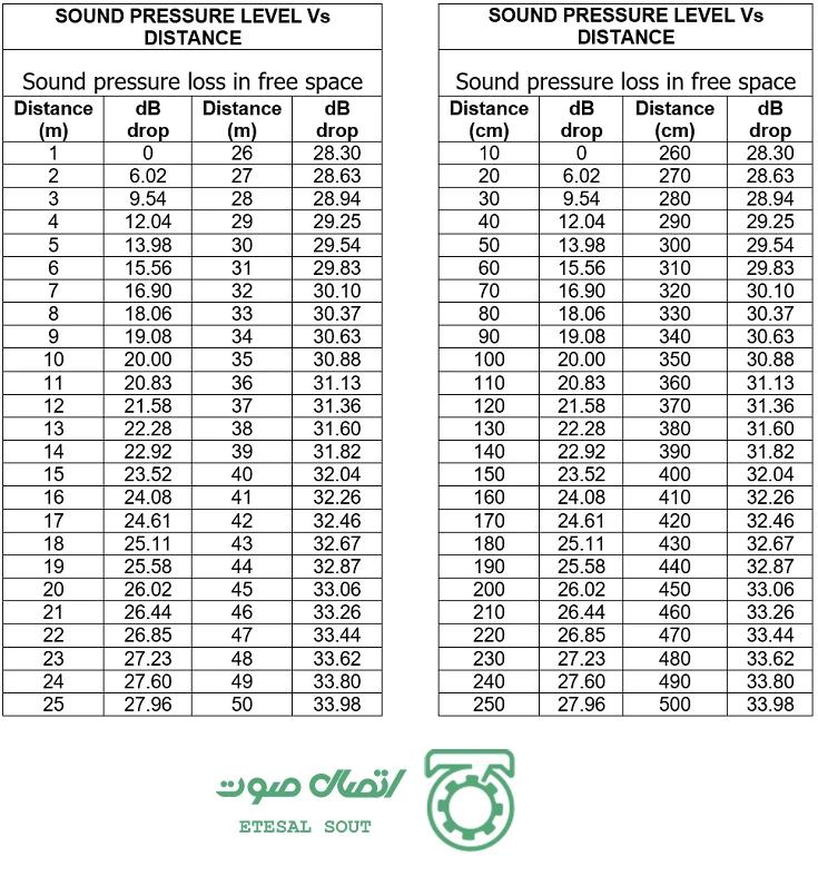 در ستون سمت راست این دیاگرام، شما میتوانید عبارت dB SPL change را مشاهده میکنید که نشان دهنده افت صدا بر حسب دسیبل است. هرچه به سمت پایین نمودار حرکت میکنیم این میزان نیز بیشتر میشود. در ستون سمت چپ، شما عبارت Distance in feet را مشاهده میکنید. این عبارت به شما میگوید که در چه فاصلهای افت صدا روی میدهد. همانطور که میبینید ترکیبی از فاصله بر حسب فوت (Feet) و متر (m) در کنار هم ذکر شده است. با بررسی این موضوع متوجه میشویم که برای مثال اگر ما از یک بلندگو با توان 100 دسیبل به اندازه 152 متر فاصله بگیریم، شاهد کاهش 40 دسیبلی صدای آن خواهیم بود و در بهترین حالت تنها 60 دسیبل از صدای آن برای ما قابل دستیابی است. این موضوع به خصوص برای طراحی سیستمهای پیجینگ پخش موسیقی و سخنرانی بسیار مهم است.
