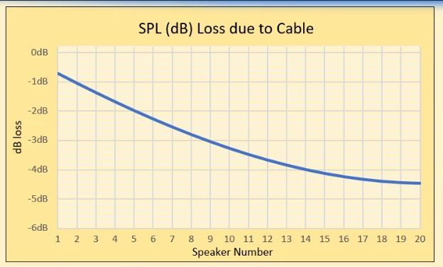 همانطور که در نمودار پیداست، ما در اسپیکر ابتدای تقریبا چیزی نزدیک به یک دسیبل افت صدا در کابل را شاهد هستیم، اما این میزان برای اسپیکر بیستم مان، چیزی بیشتر از 4 دسیبل خواهد بود. از نظر کلی این افت قابل قبول است. برای بهبود کیفیت صدا می‌توانید چند راهکار مختلف را تجربه کنید. برای مثال من طول کلی سیم را 300 متر قرار دادم، با این کار افت صدا به 3 دسیبل کاهش پیدا کرد. یا با کاهش تعداد اسپیکرها به 10 عدد این مقدار به کمتر از 2 دسیبل رسید.